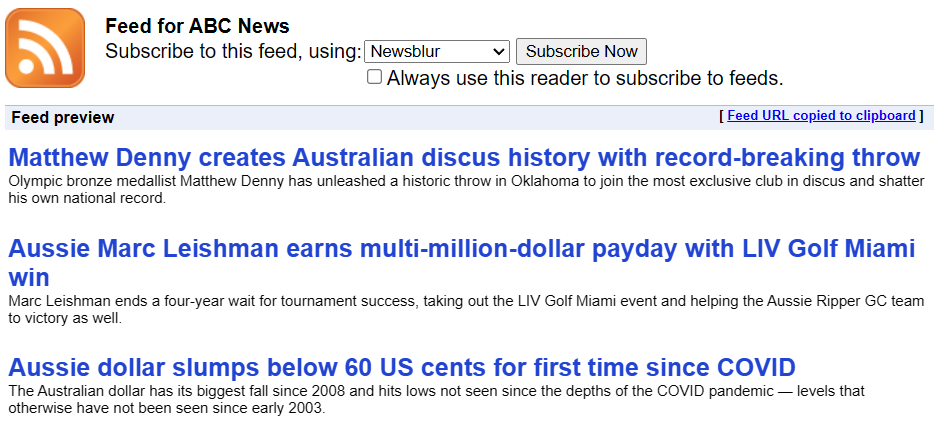 This works very handily for news sites. Below, you can see what the RSS feed for the ABC looks like: every time the website updates due to a new article being published, it gets broadcast through the RSS feed: