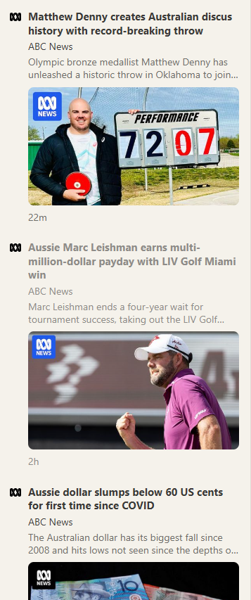 Regardless, it does a good job of showing just how simple and bare-bones RSS can be, the article title and summary line. You're able to click each headline to jump over to the actual article on the abcnews website if you want to read it.