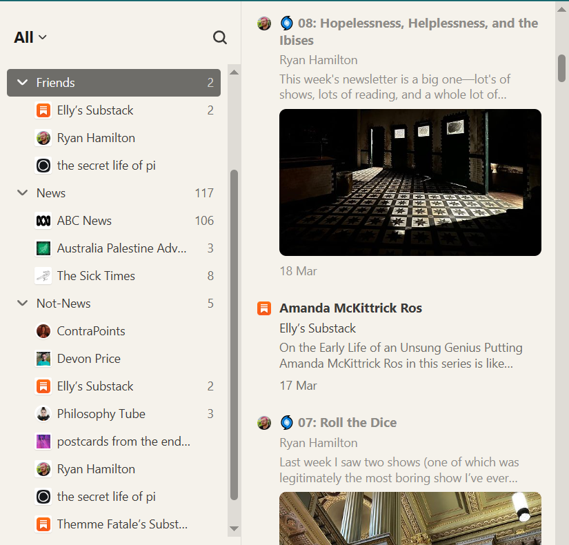 I've only had Feedbin and its RSS feeds set up for about a week, but it's been so nice to have a place to go that isn't twitter/facebook/instagram if I'm bored and want to read something on my phone! I've started getting through the backlog of my friends' newsletters, and I was able to read the latest Devon Price essay without needing to be told by Substack or Instagram that it had been published! Very exciting stuff.